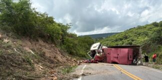Caminhão carregado com gerador tomba na serra dos tucuns, em Crateús